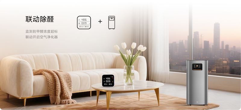聯(lián)動(dòng)除醛:當(dāng)豪恩空氣質(zhì)量檢測儀監(jiān)測到甲醛超標(biāo)時(shí),自動(dòng)聯(lián)動(dòng)空氣凈化器進(jìn)行凈化。新裝修用戶無需頻繁往返開窗,省時(shí)省心。