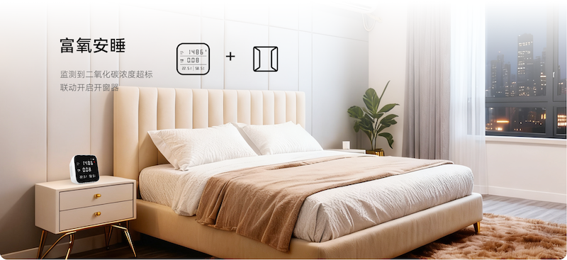 富氧安睡:當(dāng)豪恩空氣質(zhì)量檢測儀監(jiān)測到二氧化碳濃度過高時(shí),自動(dòng)聯(lián)動(dòng)開窗器通風(fēng),不影響睡眠,保障整夜富氧環(huán)境。
